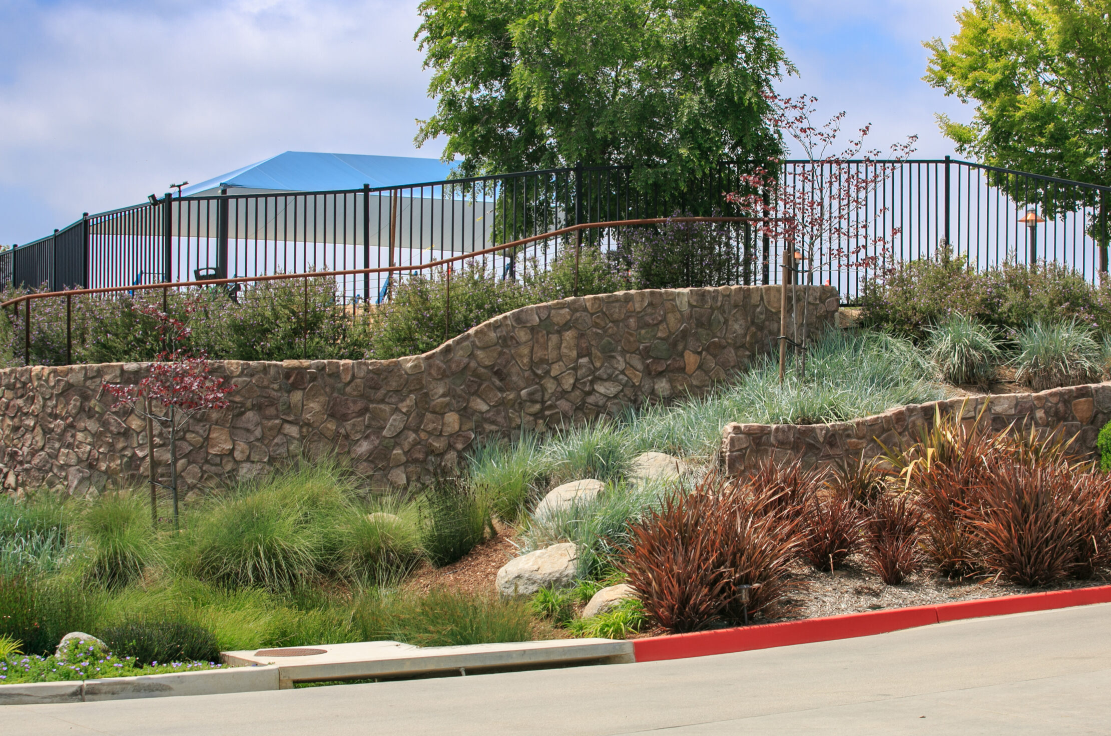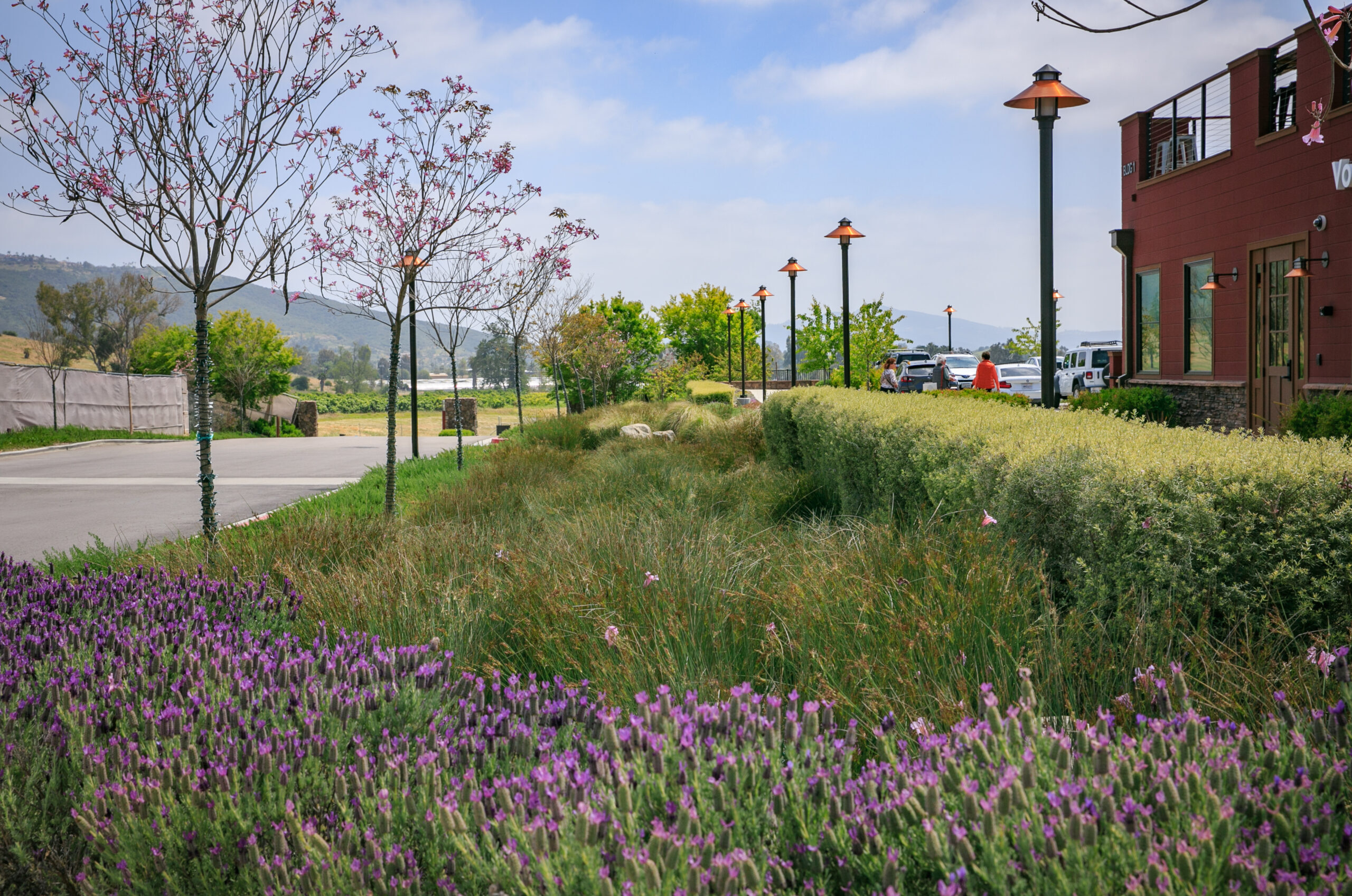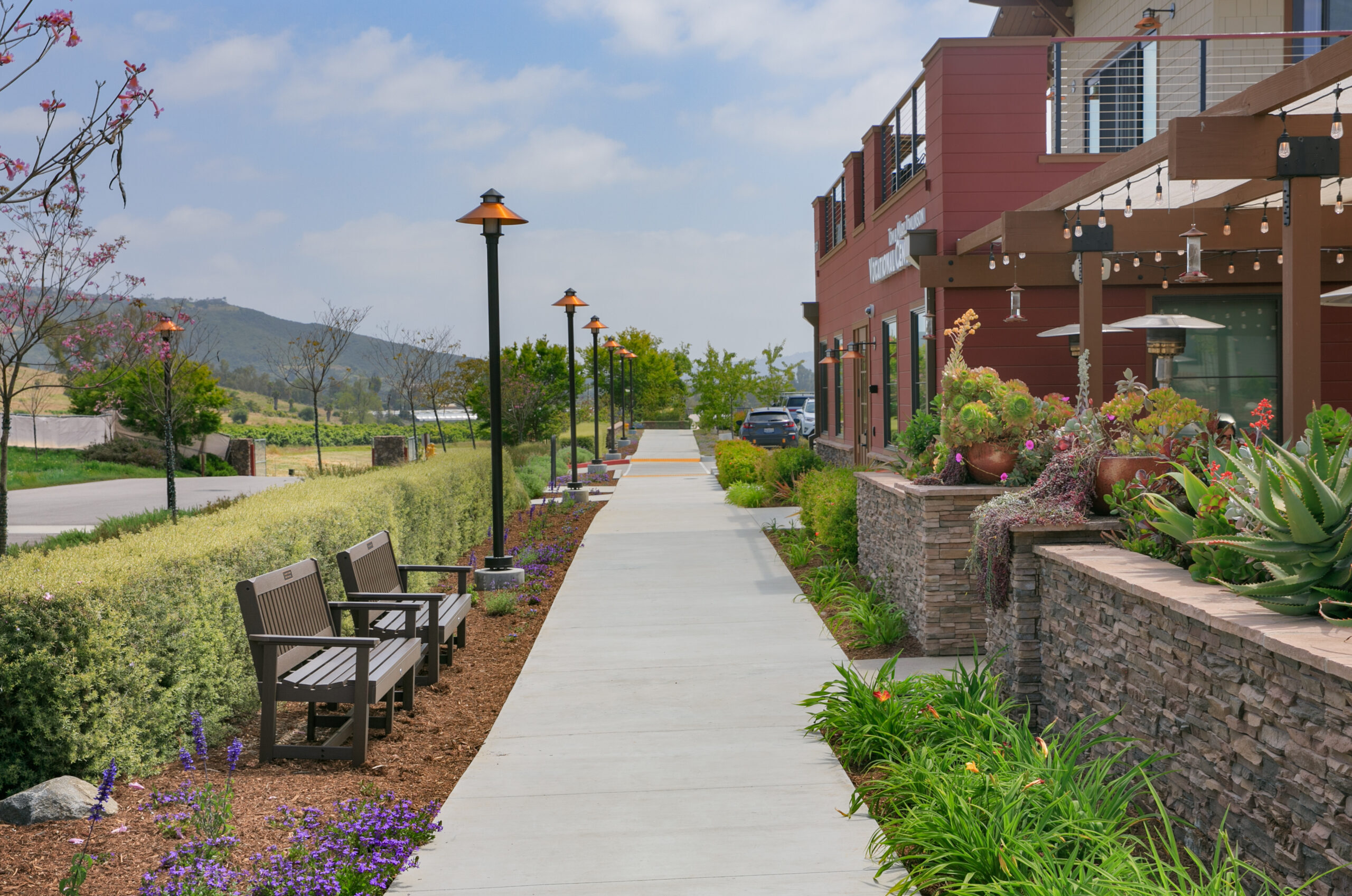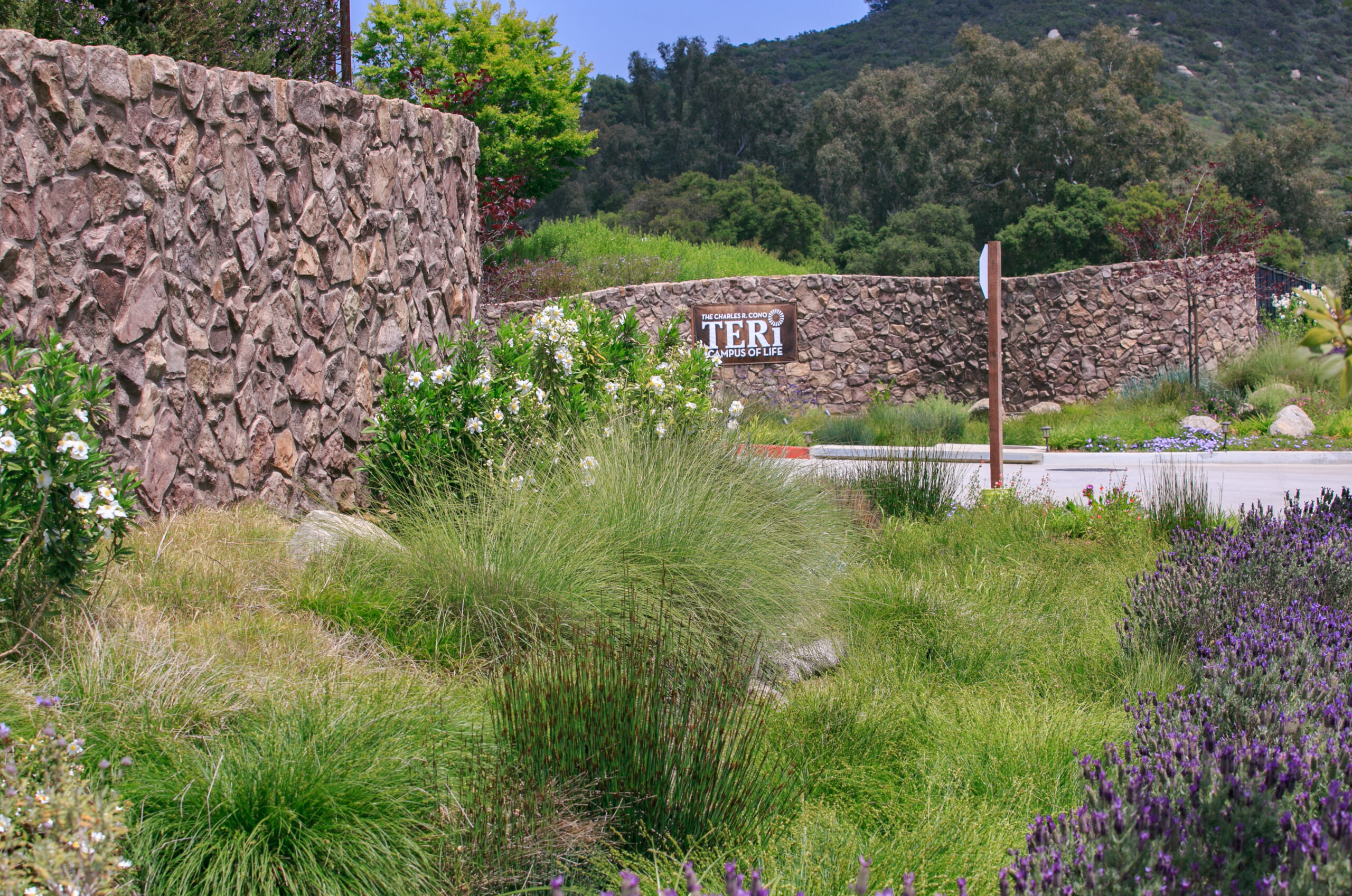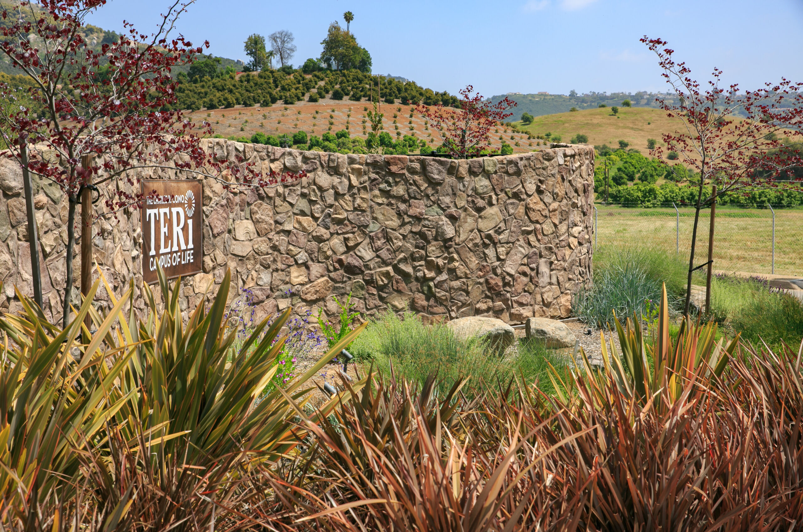 TERI Campus of Life spans 20 acres of opportunity. Opportunity for people with special needs to learn employable skills and interact with large and small groups. The Vocational Building is the first phase and includes stone walls at the entrance undulating through the landscape emulating the surrounding hills, a cafe open to the public serving farm to table entrees, a covered outdoor exercise gym and a year round display of colorful native and drought tolerant plantings and a large crop field from which the culinary department pulls from to serve guests.
